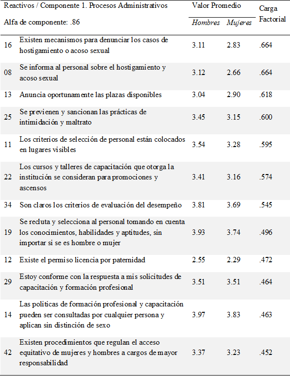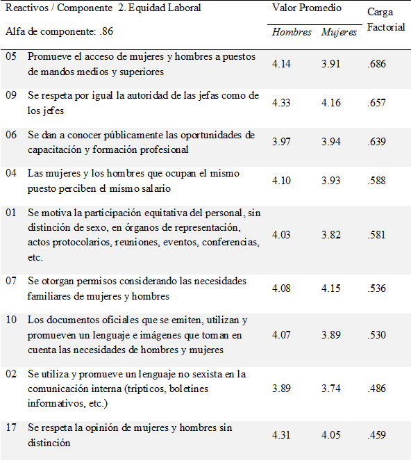 En los cuadros 2, 3, 4 y 5 se muestran los reactivos que lograron discriminar y se agruparon dentro de los componentes antes mencionados, la carga factorial que aportan así como el valor promedio por sexo y su respectiva Alfa de Cronbach para cada uno. En general, la carga factorial de mayor peso fue de .686 y se ubica en el componente nombrado Equidad Laboral, mientras que la carga factorial de menor peso fue de .452 y se encuentra en el componente de Procesos Administrativos. Estas cargas factoriales se consideran adecuadas para el tamaño de la muestra, según Hair y cols. (2007).