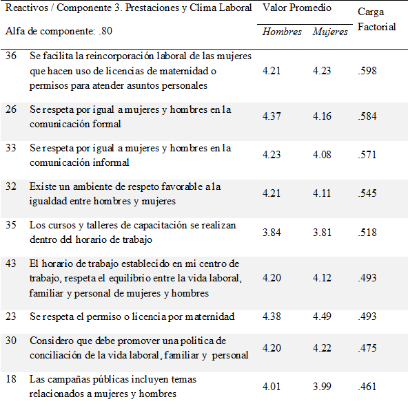 En equidad laboral se agruparon los reactivos sobre las prácticas cotidianas en el entorno laboral como la igualdad de condiciones en salarios, el lenguaje no sexista o el respeto a las jefaturas femeninas. También incluyó la participación equitativa en órganos de representación y en actividades de capacitación. Los reactivos que evalúan capacitación como aprendizaje a través de talleres y promociones de actualización, se ubican en el componente 1, son el 22, 29 y 14. El reactivo 6 que está en el componente 2, evalúa únicamente si las oportunidades de capacitación y formación son públicas. No denota si las personas aprenden o actualizan sus conocimientos para mejorar su rendimiento. Prestaciones y clima laboral agrupó reactivos relacionados con la comunicación formal e informal, así como otros sobre la conciliación entre la vida laboral y familiar.