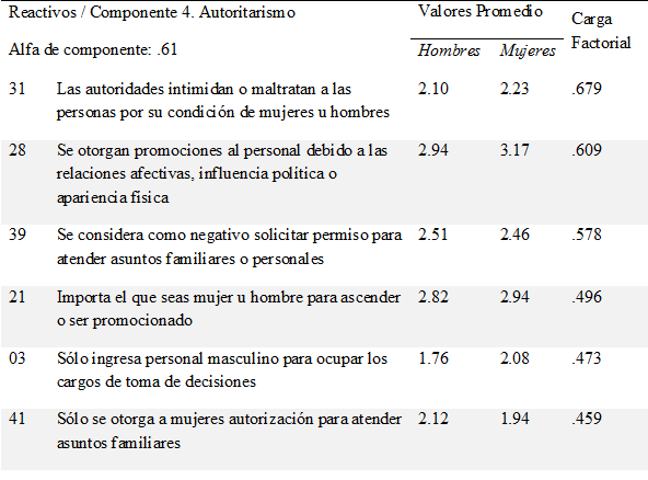 Finalmente el componente que agrupó menos reactivos fue el de autoritarismo en el que se incluyeron aquellos reactivos relacionados con la intimidación y el maltrato por condición de género y la promoción sesgada por sexismo o influyentismo. Además se agruparon otros relacionados con permisos o autorizaciones para atender problemas familiares y personales.