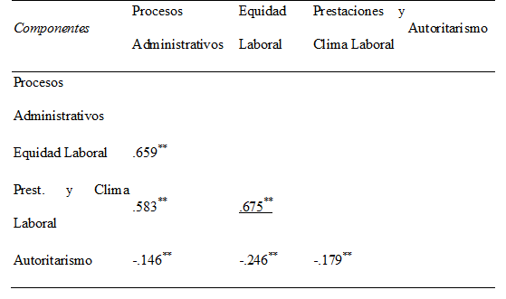Una vez realizado el análisis que permitió conocer qué reactivos se aglutinaban, se analizó cómo correlacionaban los cuatro componentes obtenidos encontrando la correlación mayor entre “equidad laboral” y “prestaciones y clima laboral” con valor moderadamente alto pero estadísticamente significativo (Hernández-Sampieri y cols. 2006). Tal tendencia no se observó en los componentes restantes (cuadro 6).