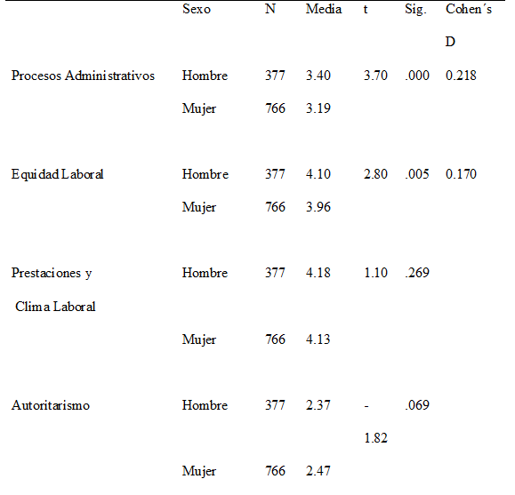 En el cuadro 7 se presenta la prueba t de Student para muestras independientes por sexo y se observan valores altos en las medias estadísticas para tres de los cuatro componentes. Se observa además, una diferencia estadísticamente significativa al .000 y al .005 para los dos primeros componentes denominados Procesos Administrativos y Equidad Laboral en los que las mujeres obtienen una media alta en relación con la media teórica pero menor (3.19 y 3.96) que la media alcanzada por los hombres. Esto indica que perciben menos afectación en relación con los procesos administrativos de su institución y menos equidad laboral que los hombres.