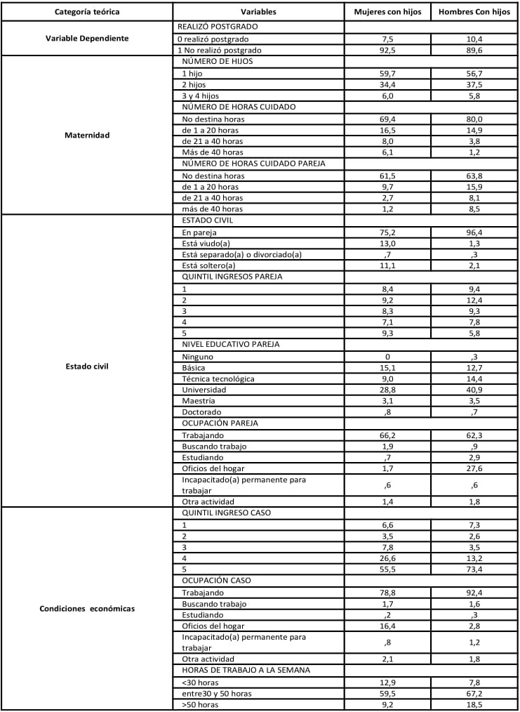 La Tabla 1 muestra los descriptivos de cada variable según sexo y tenencia de hijos. En primer lugar se evidencia un menor número de mujeres con hijos que han podido realizar estudios de postgrado, en comparación con los hombres esto puede estar relacionado con la mayor dedicación de horas al cuidado de niños y a la menor participación de sus parejas en estas actividades.