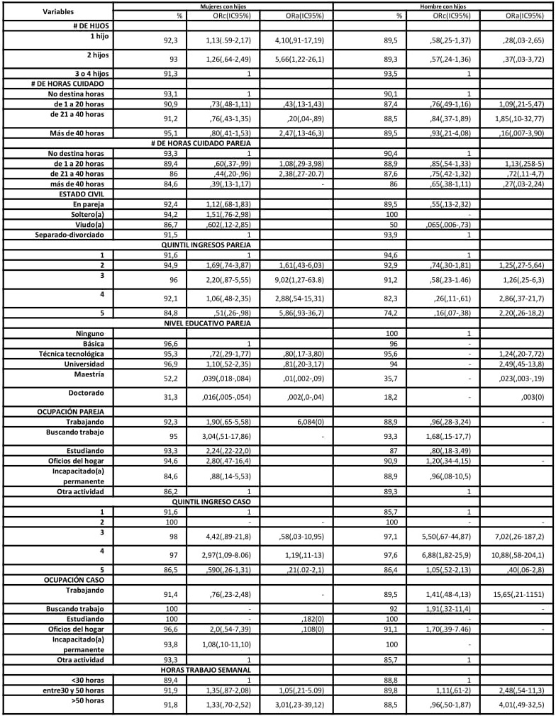 Para analizar la dimensión asociada a las responsabilidades familiares se incluyeron las siguientes variables: el número de hijos menores de 18 años, para estimar el efecto inmediato de la responsabilidad de cuidado de niños sobre la vd; en forma categórica se incluyen las horas semanales destinadas al cuidado de niños (no destina horas, menor de 20 horas, de 21 a 40 horas y más de 40 horas).