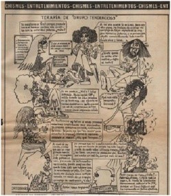 Existe una disputa constante entre Somos y El Caudillo. “Acabar con los homosexuales”, era el lema que se estableció en la revista de la ortodoxia peronista. Originaria del Grupo Tacuara, El Caudillo dedicaba gran cantidad de páginas al hostigamiento de la diversidad sexual que no cumplía con el estereotipo heteronormativo occidental y católico. No sólo explicitaban “No queremos más homosexuales, que se vayan a los países amigos. Erradicarlos o matarlos”[13], sino que los satirizaban desde la sección humor con chistes titulados “Terapia de Grupo Tendencioso”[14] donde el homosexual era representado de forma liberal-hippie, narcómana o en actitudes esquizofrénicas.