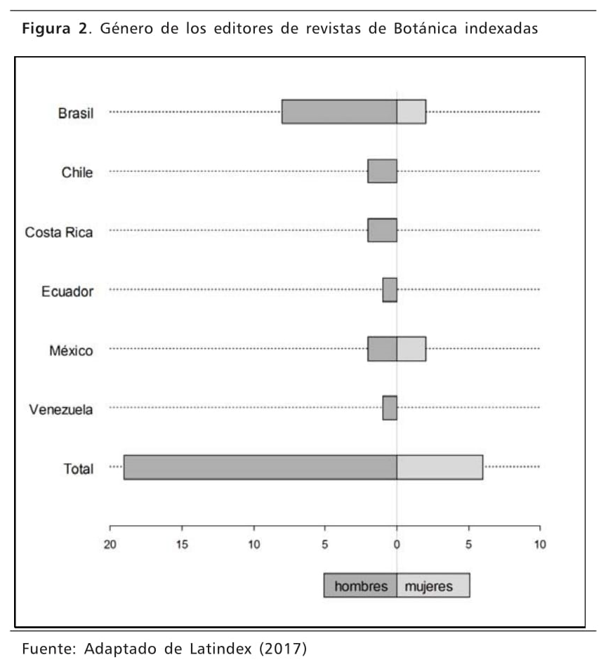 En Brasil, en las pasadas décadas, las mujeres han participado más que los hombres en el Congreso Brasileño de Botánica (Pilon y Durigan, 2011), además, desde el 2001 las mujeres son mayoría (60%) entre los becarios en Botánica del Consejo Nacional de Desarrollo Científico y Tecnológico de Brasil (Guedes et al., 2015). Pilon y Durigan (2011) sugieren que la predominancia de mujeres en la Botánica brasileña está asociada a la baja valoración de esta profesión en el país. Las mujeres se profesionalizan en las carreras con más bajo estatus o en carreras etiquetadas como femeninas, como es la Botánica (Velho y Léon, 1998).