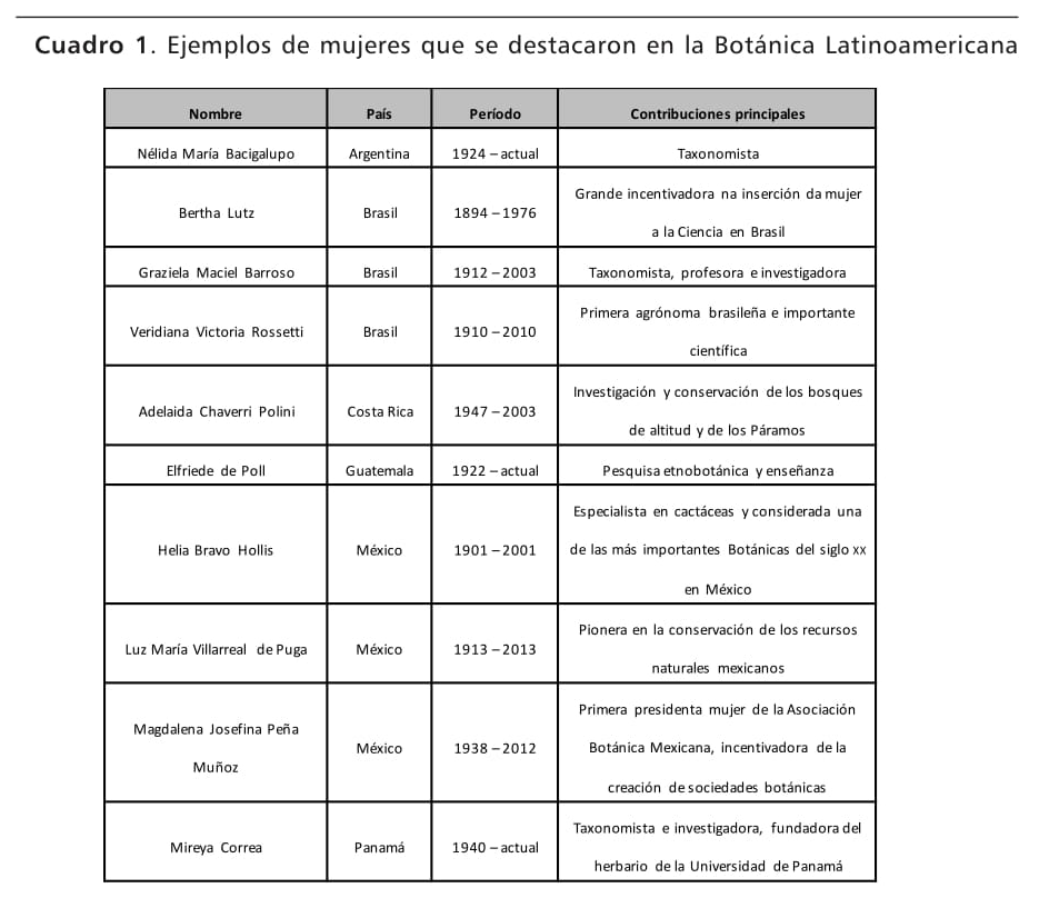 Latinoamérica está definida como el futuro “continente femenino”, presentando una proporción femenina de progresivo aumento (Alves, 2014) y las mujeres han representado un importante papel en el desarrollo de la Botánica. Marianne North fue considerada una viajera naturalista pionera, quien exploró Brasil a finales del siglo xix. Ella relató su experiencia naturalista en bitácoras de viaje y pintó una serie de cuadros sobre las flores, las plantas y la vegetación en general. Marianne North colectó también ejemplares botánicos para el herbario Kew Garden de Londres, sin embargo, eso está citado de manera informal en la literatura. Su trabajo, sobre todo sus escritos, han sido prácticamente ignorados, son de los pocos relatos de viaje de una mujer naturalista en Latinoamérica en esa época. Dickenson (2015) considera que Marianne North fue la precursora de la actual preocupación del ambiente natural y la conservación de la biodiversidad. Asimismo, entre los siglos xx y xxi hubo mujeres que se destacaron como pioneras en la Botánica Latinoamericana en Argentina, Brasil, Costa Rica, Guatemala, México y Panamá (Cuadro 1).