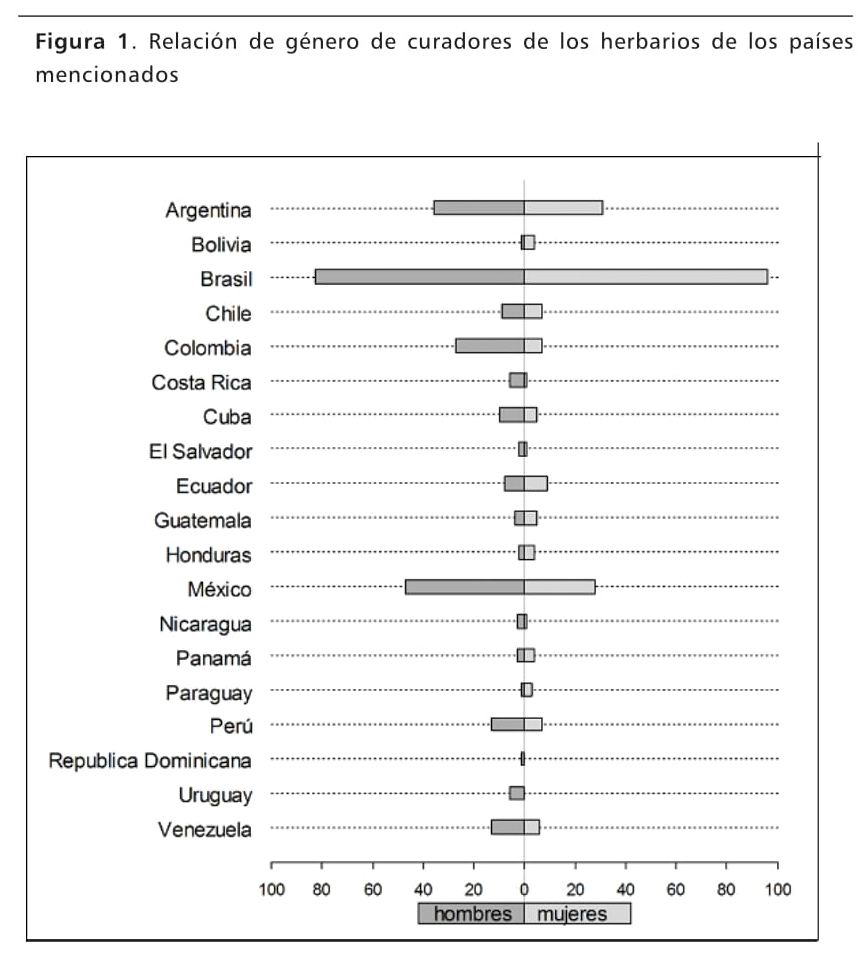 En Argentina, Bolivia, Brasil, Chile, Colombia, Costa Rica, Cuba, Ecuador, El Salvador, Guatemala, Honduras, México, Nicaragua, Panamá, Paraguay, Perú, República Dominicana, Uruguay y Venezuela se registran 448 herbarios en el listado internacional (NYBG Steere Herbarium, n.d.). Los países con mayor número de herbarios fueron Brasil (159 en el Index Herbariorum y 200 en la Rede Brasileira de Herbários, RBH, según Vieira y Gasper, 2015), seguido por México (68), Argentina (53), Colombia (31) y Cuba (21). Entre los curadores listados están 219 mujeres (44%) y 275 hombres (56%). Solamente en Brasil, Ecuador, Guatemala y Panamá el número de mujeres curadoras superó a los hombres. Sin embargo, en Colombia, México y Perú el número de hombres listados como curadores fue mayor que el de mujeres. En los demás países los valores variaron al 50%, demostrando un equilibrio de género (Figura 1).