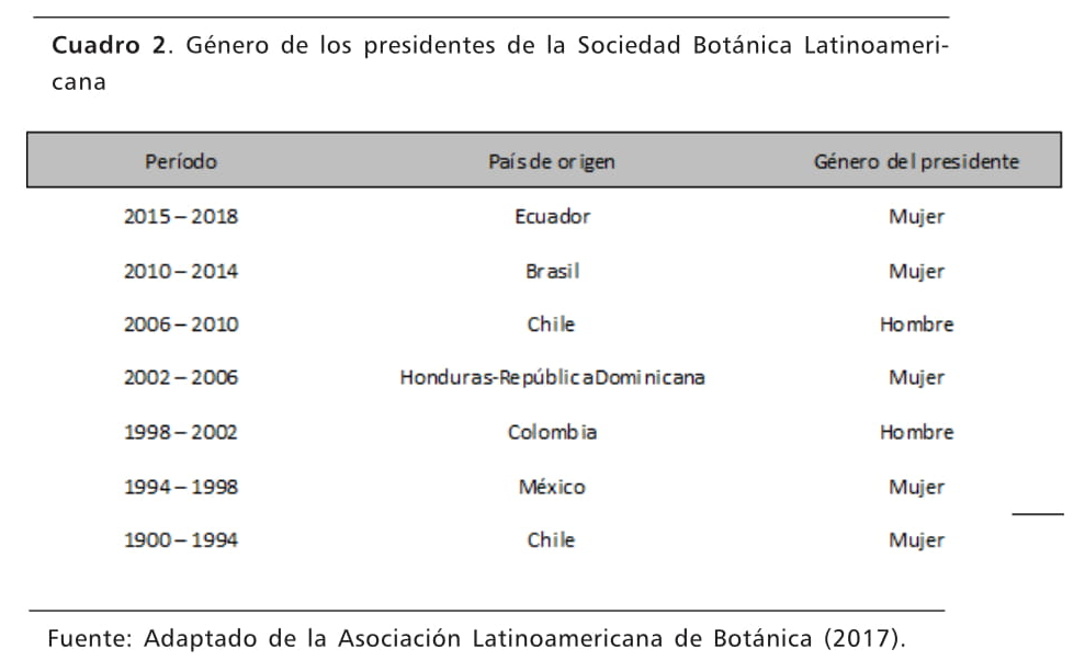 La Asociación Latinoamericana de Botánica fue fundada en 1978 con el objetivo de “responder a la imperiosa necesidad de mejorar la comunicación y las relaciones de trabajo entre los botánicos Latinoamericanos” (Asociación Latinoamericana de Botánica, 2017). Desde 1990 hasta los días actuales la Asociación Latinoamericana de Botánica fue presidida por cinco mujeres (71%) y dos hombres (29%), demostrando una mayor participación femenina (Cuadro 2).