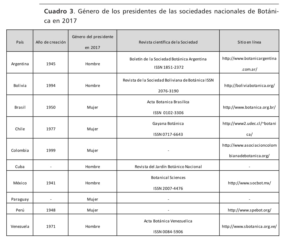En relación con las sociedades nacionales de Botánica, entre los 19 países latinoamericanos considerados en este artículo, solamente 10 de estos presentaron sociedades organizadas: Argentina, Bolivia, Brasil, Chile, Colombia, Cuba, México, Paraguay, Perú y Venezuela. Actualmente estas sociedades son presididas por cinco mujeres y cinco hombres (Cuadro 3). Las sociedades botánicas de Brasil, Chile, Colombia, Paraguay y Perú son actualmente presididas por mujeres.