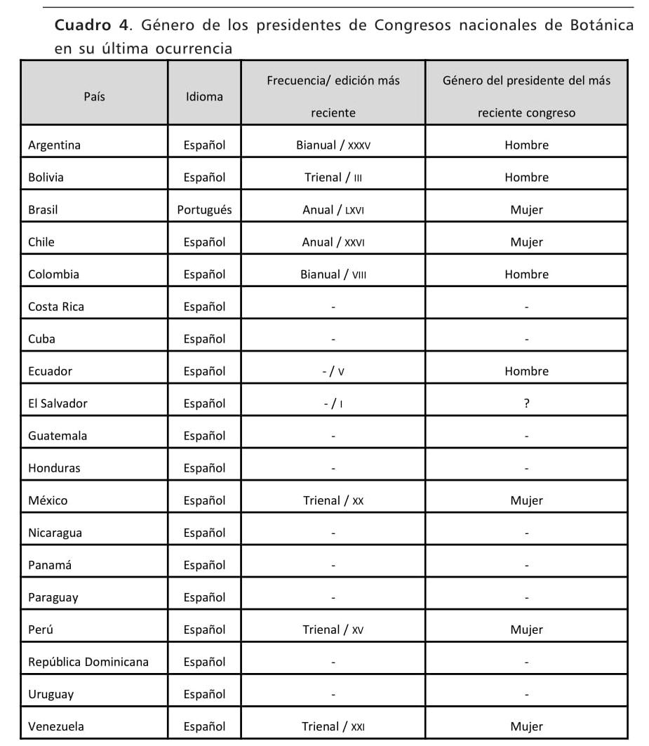 El Congreso Latinoamericano de Botánica se presenta con frecuencia cuadrienal, el evento más reciente se llevó a cabo en el año de 2014, organizado por Brasil y fue presidido por la Dra. Tania dos Santos Silva (Asociación Latinoamericana de Botánica, 2017). Entre los 19 países analizados, solamente 10 presentaron eventos nacionales específicos de Botánica. Estos congresos nacionales de Botánica ocurren con diferente frecuencia: en Brasil y Chile son anuales, en Argentina y Colombia son bianuales, y en Bolivia, Ecuador, El Salvador, México, Perú y Venezuela, son trienales. En su última edición, los Congresos Nacionales de Botánica fueron presididos de forma equilibrada en relación a género (Cuadro 4). Brasil demostró mayor tradición en los congresos de Botánica, en su 66a edición, seguido de Argentina (35a edición), Chile (26a edición), Venezuela (21a edición) y México (20a edición).