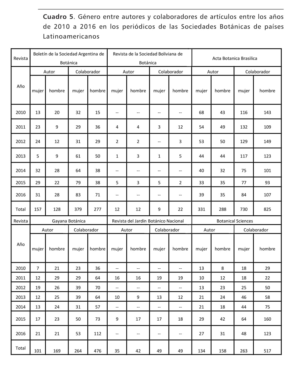 Las revistas científicas vinculadas a las Sociedades botánicas de los países Latinoamericanos fueron seleccionadas siempre y cuando cumplieran las siguientes características: ser indexada, arbitrada por pares, con periodicidad continua, con reconocimiento nacional/internacional y con artículos disponibles en los años más recientes. Fueron analizados un total de 1,567 artículos en cuanto a género de los autores (primer autor y colaboradores), publicados en los años de 2010 a 2016. Las revistas científicas consideradas en este artículo fueron: Boletín de la Sociedad Argentina de Botánica (2010-2016), Argentina; Sociedad Boliviana de Botánica (2010-2016), Bolivia; Acta Botanica Brasilica (2010-2016), Brasil; Gayana Botánica (2010-2016), Chile; Revista del Jardín Botánico Nacional (2010-2016), Cuba; y Botanical Sciences. Formerly Boletín de la Sociedad Botánica (2010-2016), México.