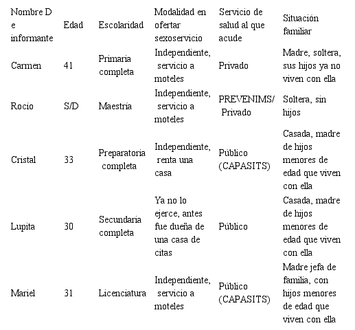 Las informantes fueron cinco mujeres potosinas mayores de edad, de diversa escolaridad y que al momento del estudio ofertaban servicios de prostitución por internet. En la tabla no. 1 pueden apreciarse con mayor detalle algunas de sus características sociodemográficas.