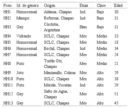 Posteriormente, se realizaron entrevistas semi estructuradas a profundidad ―enfocadas en los ejes: identidad, imaginarios y violencia― para averiguar el impacto de los imaginarios sexo/genéricos locales en sus biografías; asociándoles a modelos sexo/genéricos aprendidos. La muestra teórica constó de 13 varones de diferentes etnias y edades, residentes de San Cristóbal de Las Casas; se incluyó a una mayoría de oriundos y nativos de otras comunidades y ciudades de Chiapas, los menos fueron de otros estados mexicanos y uno era extranjero. Como muestra la Tabla 1, la auto adscripción de la identidad de género ―explicadas más adelante en la Tabla 3― fue factor incluyente/excluyente de participación. La distinción por clase gravitó en el ingreso mensual familiar, según el salario mínimo del ejercicio fiscal mexicano de 2018, y se asignaron claves pseudónimas para brindar anonimato a los participantes.