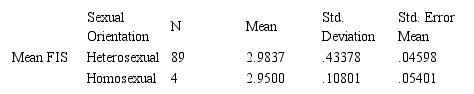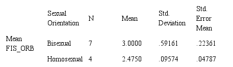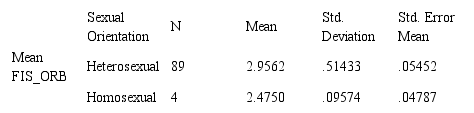 However, when running the T-test with the AFIS subscale of body objectification the ORB, portraying a significant relationship among the two concepts. Heterosexual and homosexual women seem to accept more the ORB, the second subscale composed of 10 items. Two T-tests were run, the first showed that bisexual women tend to accept the ORB more than homosexual women with a p=0.048 and a t=.723 (Table 9), and the second showed that heterosexual women accept the ORB more than homosexual women with a p=0.015 and t=1.860 (Table 10).