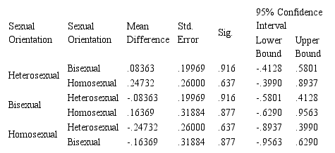 While running both a T-test and an ANOVA comparing the three groups with the OBC scale, the results proved insignificant. Three T-tests were run to analyze the relationship of sexual orientation with the objectification of the female body. The first two compared the relationship with body objectification consciousness of heterosexuals and bisexuals, and heterosexuals and homosexuals, showing insignificant results with a p=0.157 and p=0.737 respectively. The last T-test compared the relationship between sexual orientation and body control beliefs of bisexuals and homosexuals, portraying marginal significance. Later an ANOVA test was run and denied this relationship with a p=0.596, while confirming there is no relationship between any sexual orientation and OBC (See Table 8).