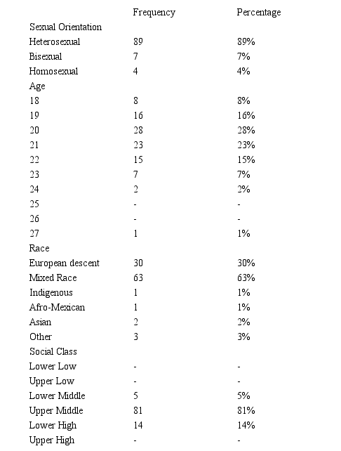 A total sample of 100 female university students aged 18-27 years, with a mean age of 20.57 and a standard deviation of 1.56, were included in this study. Racial groups and social class were limited and showed almost no diversity (See Table 1). Both aspects where self-identified by the participant, in the case of class a table portraying the composition of each class making it easier for the participant to identify which group did she belong to (See Table 11).