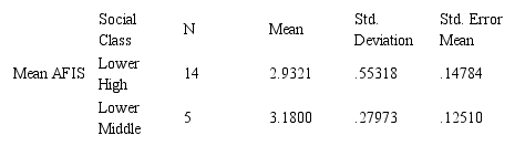 Social class also seemed insignificant in predicting the internalization of femininity ideology, showing no real difference between the answers of the participants who identified themselves as members of the lower middle class and the lower high class. The lower middle class was compared with the lower high class since they represent the lowest and highest classes found in the sample. The results show no real relation between class and acceptance of the femininity ideology with a p=0.213 and a t=1,008, disregarding Hypothesis 3 (H3).