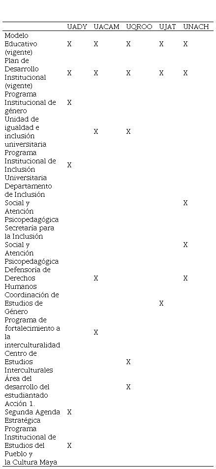 Para este estudio se definió la siguiente cláusula o matriz semántica: Nombre del documento ―Objetivo― todas las apariciones de las palabras “género” e “inclusión”, como las unidades de análisis. Para fines del presente trabajo sólo se contempla el análisis de contenido de la matriz semántica “Nombre del documento-objetivo-inclusión”. Por su parte, las unidades de muestreo fueron 24 documentos institucionales de acceso público a través de sus páginas digitales oficiales de un total de 5 universidades públicas del sur-sureste mexicano. A continuación, en la tabla 1 se mencionan los documentos institucionales analizados por universidad, considerando que éstos ayudan a comprender el lugar que cada universidad le otorga al género y la inclusión.