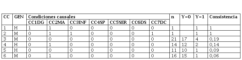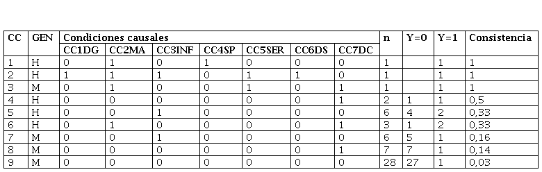 En la columna 2 aparece el género de la persona encuestada, entre las columnas 3 y 9 de las tres tablas se encuentran las condiciones causales, en la columna 10 se presenta la evidencia del número de personas encuestadas que poseen la configuración causal, en la 11 se muestran los casos donde el resultado fue negativo, en la 12 los casos positivos y en la columna 13 se encuentra el nivel de consistencia[4].