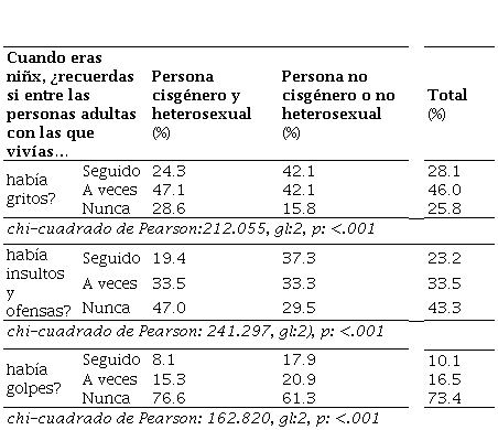 Los datos resumidos en la Tabla 1 muestran diferencias significativas entre los antecedentes de violencia en ambos grupos de estudiantes. 24.3% del estudiantado declara que experimentaron gritos entre las personas adultas a diferencia del 42.1% de las personas no cisgénero o no heterosexual. En el mismo sentido de las personas cis y hetero, 28.6% afirma que nunca presenció gritos a diferencia del 15.8% de las personas de la diversidad sexual. Al aplicar la prueba Chi-cuadrado de Pearson, se obtiene un valor de 212.055 con 2 grados de libertad que corresponde a un valor p. <.001. Por tanto, concluimos que hay una diferencia significativa. Las personas con orientaciones e identidades no normativas experimentan este tipo de violencia con más frecuencia.