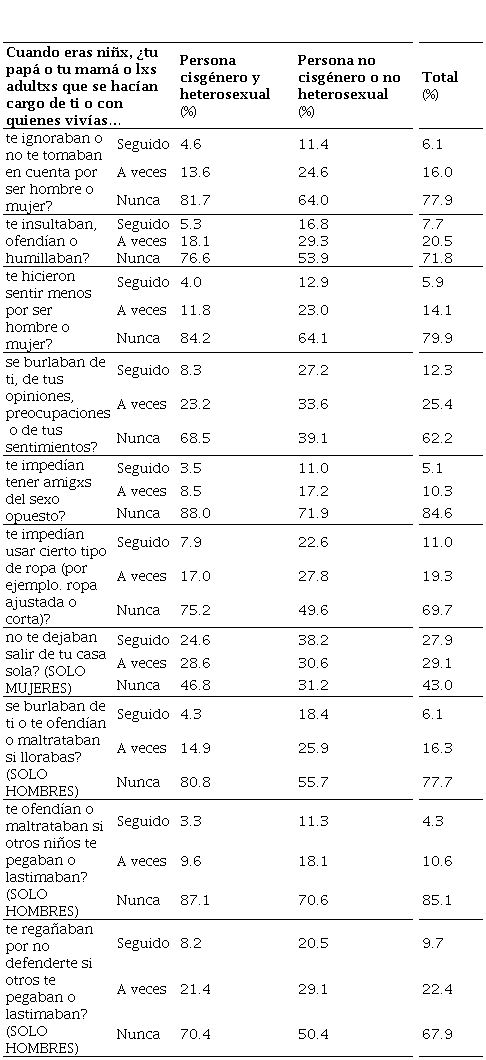 Ante la pregunta: “¿Te ignoraban o no te tomaban en cuenta por ser hombre o mujer?”, 4.6% de las personas cisgénero o heterosexuales respondieron que les sucedía con frecuencia, a diferencia del 11.4% de las personas de la diversidad sexual. Mientras que las personas que dijeron sufrir este tipo de violencia a veces fueron 21.4% y 29.1% respectivamente. Finalmente, quienes nunca sufrieron esta violencia fueron 70.4% de las personas cisgénero y heterosexuales y sólo 50.4% de las personas no heterosexuales o no cisgénero. Los datos permiten observar una notoria diferencia entre la frecuencia con que las personas no heterosexuales o cisgénero sufren este tipo de violencia psicológica relacionada con el género en la infancia. Por supuesto, las mujeres cisgénero o las heterosexuales no están a salvo, pero el problema se agrava aún más para las personas con orientaciones o identidades no normativas.