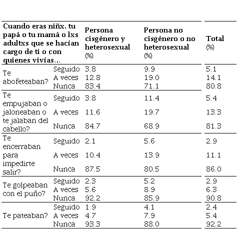 2.3% de las personas heterosexuales y 5.2% de las personas no heterosexuales o no cisgénero seguido recibieron golpes con el puño durante su infancia, 5.6% y 8.9% respectivamente dijeron sufrirla a veces, finalmente, 92.2% y 85.9%, también respectivamente, afirmaron nunca haber recibido este tipo de violencia. La prueba chi-cuadrado de Pearson muestra que existe una diferencia significativa entre ambos grupos con un valor de 47.995, 2 grados de libertad y p <.001. 1.9% de las personas heterosexuales o cisgénero recibió seguido patadas por parte de las personas adultas de su familia o con quienes vivían, así como 4.1% de las personas de la diversidad sexual. 4.7% y 7.9% respectivamente sufrieron este tipo de violencia a veces, mientras que 93.3% y 88.0% no la sufrieron nunca. La diferencia es notoria con respecto a la proporción de las personas de la diversidad sexual que sufre este tipo de violencia física. La prueba Chi-cuadrado de Pearson con valor de 415.058, 2 g.l. y p <.001, confirma que existe una diferencia significativa entre ambos grupos.