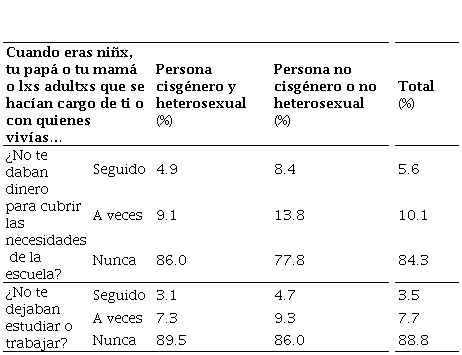 La experiencia de las personas participantes en la encuesta representativa de la población estudiantil de la red universitaria en tanto víctimas de violencia económica se recuperó a través de dos ítems. 4.9% de las personas heterosexuales y cisgénero seguido no recibían dinero para cubrir las necesidades de la escuela, lo que también experimentó el 8.4% de las personas de la diversidad sexual. La prueba Chi-cuadrado de Pearson con valor de 60.095, 2 g.l. y p <.001 nos permite rechazar la hipótesis nula y confirmar que existe una diferencia significativa entre ambos grupos.