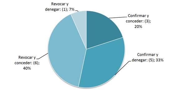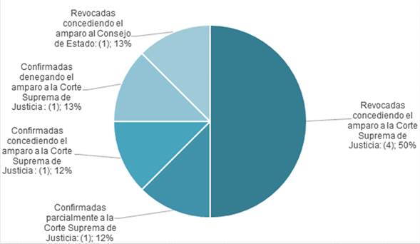 Por ejemplo, la Corte revocó para conceder el amparo, casos fallados tanto por jueces constitucionales del país como por los tribunales de cierre de las otras jurisdicciones. En este sentido, revocó para conceder el amparo el 13% de los fallos expedidos por el C. E y el 50% de los fallos expedidos por la CSJ.