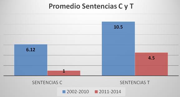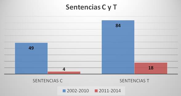 Confrontando la información antes registrada, encontré que en el periodo analizado (2011-2014), la Corte expidió 18 ST y 4 SC relativas a la libertad personal para un total de 22 sentencias en cuatro años, mientras que en el PSD, que corresponde a ocho años, se expidieron 133 sentencias entre SC y ST.