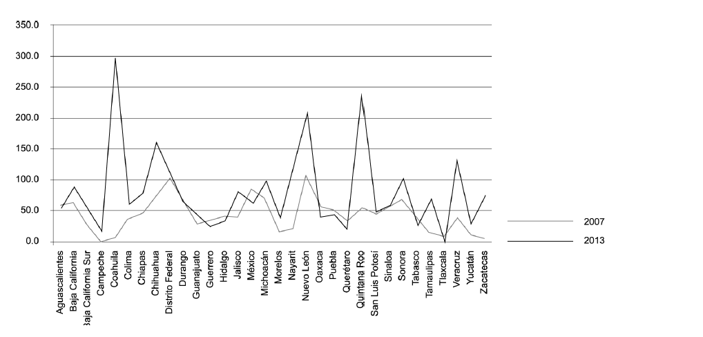 Hoy existen estados que registran una deuda superior al monto de sus participaciones. El promedio nacional del grado de dependencia de la deuda de los gobiernos subnacionales con sus participaciones aumentó de 56.1% en 2007 a 81.5% en 2013, un aumento de 25.4 puntos porcentuales, en tan sólo seis años, lo que sojuzga aún más los ingresos (véase anexo 1).