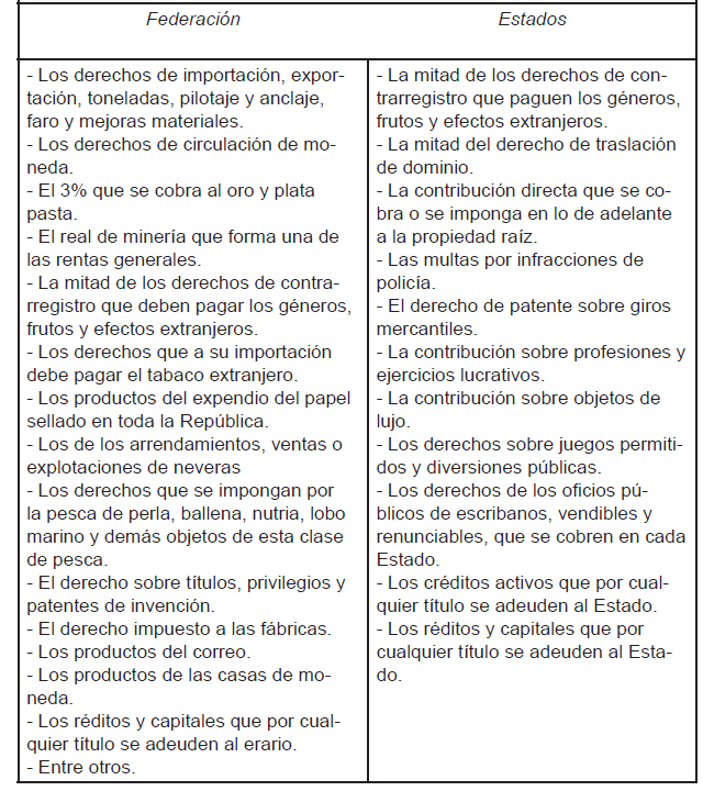 A efecto de recordar, si nosotros volteamos a la Constitución de 1857, la concepción del reparto de las facultades en materia tributaria no era un asunto de la Constitución, pues ésta contaba con un régimen muy parecido a la actual, la carta magna del 57 establecía en su artículo 72, fracción VII, que “El Congreso tiene facultad: Para aprobar el presupuesto de los gastos de la Federación que anualmente debe presentarle el Ejecutivo, e imponer las contribuciones necesarias para cubrirlo”. La redacción de 1917 fue una copia respecto de la de 1857; en ese orden de ideas, el 12 de septiembre de 1857 se promulgó una ley que clasificaba las rentas, y estableció que éstas, las contribuciones y bienes de la nación se dividían en dos partes. Primera: rentas, contribuciones y bienes generales. Segunda: rentas, contribuciones y bienes de los estados. En aquel tiempo, la división quedó decretada tal y como puede observarse en la tabla que se muestra en la siguiente página.