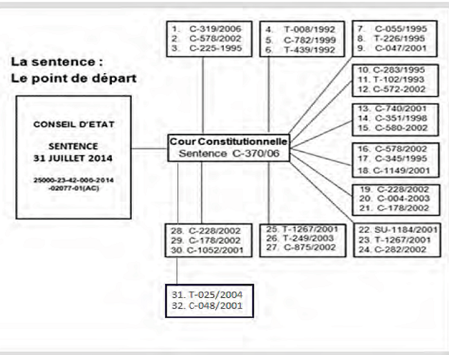 La sentence qui a servi de point de départ, est la sentence du 31 juillet 2014 du Conseil d’État.8 Dans cet arrêt, la Haute Cour Colombienne de la juridiction contentieuse administrative a décidé sur la contestation de la providence du Tribunal Supérieur administratif de Cundinamarca qui a refusé la protection du droit à la paix.