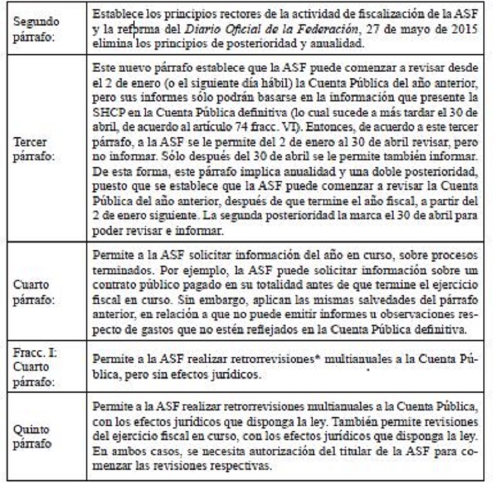 Como se ha explicado, la reforma constitucional del 27 de mayo de 2015 eliminó la mención en el párrafo segundo del artículo 79 a los principios de anualidad y posterioridad.19 La eliminación de estos dos principios se debió a que, en el contexto de la creación del Sistema Nacional Anticorrupción, se consideró que para mejorar la fiscalización de los recursos públicos tenían que cambiarse las reglas relacionadas con la anualidad y posterioridad de la labor de la ASF y de las auditorías locales.20
