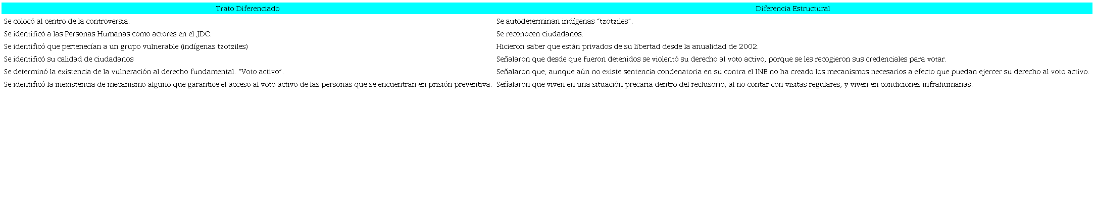 De la reflexión anterior el Tribunal Constitucional aludió a la tesis referente a las personas en prisión preventiva que no han sido sentenciadas y se encuentran amparadas bajo la presunción de inocencia, y por tanto tienen derecho a votar. Los jueces constitucionales estudiaron el contexto de las Personas Humanas -diferencia estructural- con base al problema general --trato diferenciado-. Para después, precisar y analizar los argumentos hechos valer por los actores del JDC. Como enseguida se muestra: