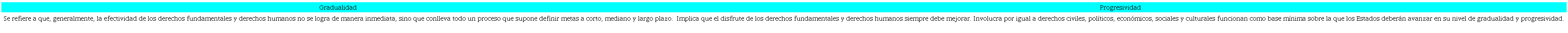 Por su parte la SCJN ha establecido que el principio de progresividad previsto en el artículo 1o. de la CPEUM y en diversos TI ratificados por el Estado constitucional democrático mexicano, manda ampliar el alcance y protección de los derechos fundamentales y derechos humanos, en la mayor medida posible hasta lograr su plena efectividad de acuerdo con las circunstancias fácticas -igualdad sustantiva- y jurídicas de la Persona Humana, conocimiento que forma parte del formante jurisprudencial. Registro 2015305, de título y subtítulo Principio de Progresividad de los Derechos Humanos. Su concepto y exigencias positivas y negativas (Tesis. 1a./J. 85/2017 (10a.), 2017). El principio de progresividad involucra tanto gradualidad como progresividad, esto lo sabemos del formante jurisprudencial. Registro 2019325 de título y subtítulo Principio de Progresividad de los Derechos Humanos. Su naturaleza y función en el estado Mexicano (Tesis: 2a./J. 35/2019 (10a.) 2019). El principio de progresividad rige en materia de los derechos humanos implica tanto gradualidad como progreso: