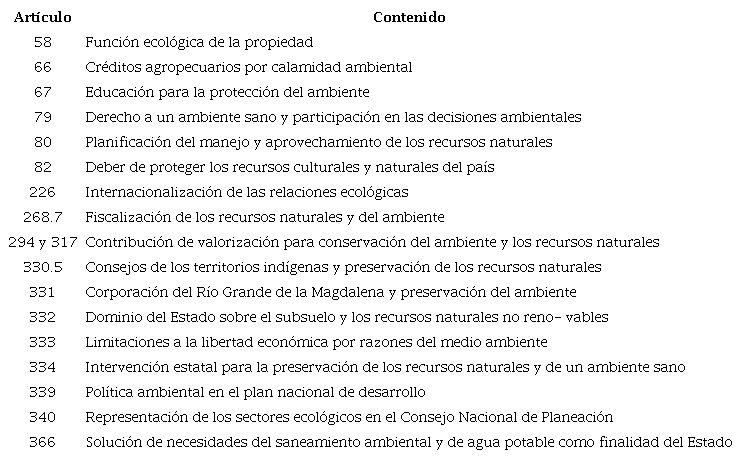 De manera específica, el carácter ecológico y la protección a la naturaleza se consagra en los siguientes artículos de la Constitución de Colombia: