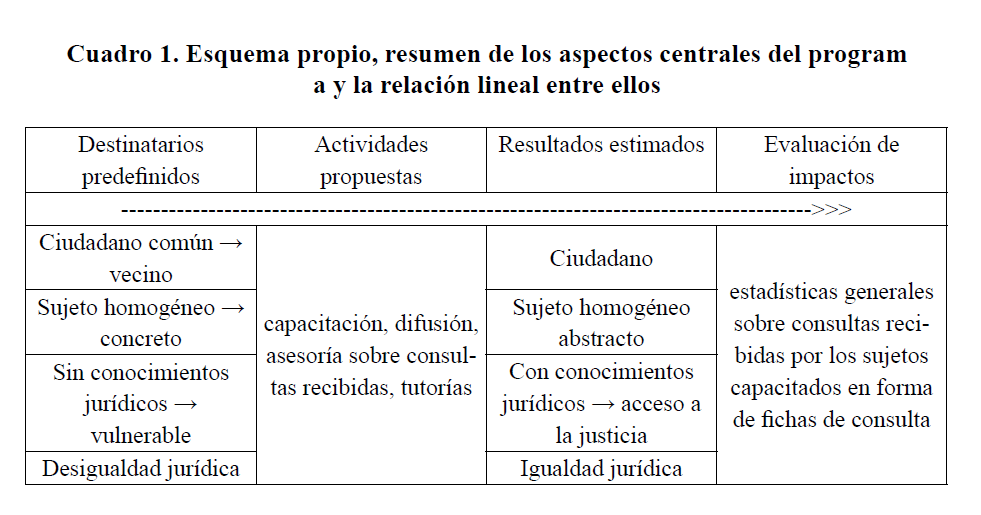 Las discusiones de equipo no solo apuntaban a las formas de pensar la otredad, sino a los impactos potenciales o producidos por ese mismo programa (articulados, obviamente, a los objetivos, actividades propuestas y las concepciones sobre los sujetos a los cuales apuntan): ¿basta con solo «democratizar» el derecho, «extender» algunos conocimientos básicos, para que los destinatarios se vuelvan unos «ciudadanos plenos» y logren «acceder a la justicia»? Lo interesante del programa era no solo que formulaba un sujeto destinatario homogéneo definido por su supuesta vulnerabilidad sino que carecía de un diagnóstico que identificara las causas de esa «falta de conocimientos jurídicos» y permitiese evaluar los resultados posibles de las acciones propuestas. De hecho, los resultados ya se encontraban predefinidos en la idea de que, luego de conocer sus derechos, los ciudadanos comunes accederían a la justicia.