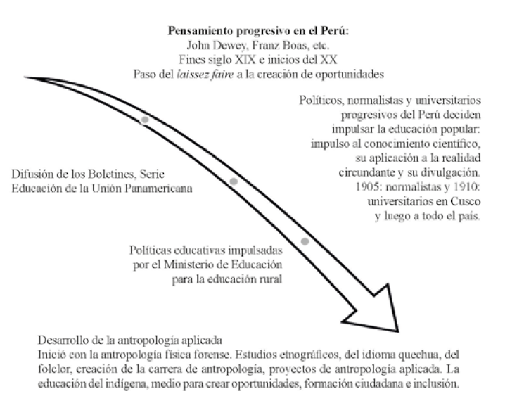 Las reflexiones descritas muestran una búsqueda constante de situar el pensamiento educativo, como un soporte moral que relaciona la pedagogía con las ciencias sociales y su aplicación para la formación de la ciudadanía dentro de la población indígena. En el gráfico siguiente se muestra el devenir del pensamiento progresivo en el Perú, desde la preeminencia de Dewey y Boas, su influencia en educadores peruanos y sus propuestas para la educación del indio, así como el impulso y la difusión que los Boletines de la Unión Panamericana dieron a las diversas experiencias de la pedagogía de la escuela activa en el continente americano, finalizando con las políticas educativas del Ministerio de Educación del Perú. Pero ya desde 1910 se había iniciado la investigación etnográfica en el Perú y su institucionalización se dio con la creación de los institutos de etnografía a mediados de la década de 1940.