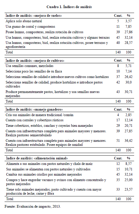 Los kamayoq encontraron en su proceso formativo una oportunidad para darse cuenta de las carencias y comenzaron a mirar de otra manera sus propias prácticas de (i) recrear las técnicas propias, (ii) aplicar otras técnicas pertinentes a la solución de sus problemas y (iii) tomar la decisión para mejorar sus activos naturales en sus propias fincas familiares. Es decir, se dieron cuenta que habían mejorado la calidad de sus tierras de cultivo, ganado, pastos y manejo del agua. Según la información recogida en campo, la demostración más evidente se halla en las transformaciones e incrementos en cada uno de los componentes de su sistema de producción agrícola y pecuario que están enteramente vinculados con la manera como los kamayoq han logrado modificar y optimizar sus activos naturales, que articulados se van a evidenciar en mejoras sustanciales que van a producir efectos multiplicadores. En los siguientes cuadros presentamos las expresiones de dichos impactos en el capital natural de los kamayoq: