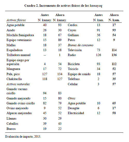 Este hecho impactó en la generación de una serie de «aperturas de oportunidades» y alternativas de solución a los principales problemas del agricultor andino que el kamayoq capitalizó y convirtió en posibilidades de autoempleo, a partir de la aplicación en su predio (capital natural) de las capacidades ampliadas, y cuya expresión se objetivizó en la mejora de la calidad de sus recursos y la mayor disponibilidad de estos (pastos cultivados, compra de ganado mejorado, disponibilidad de pasto, riego por aspersión, mejoramiento de suelos con abonamiento natural). Ello permitió que la familia del kamayoq empiece a incrementar sus rendimientos y sus ingresos mediante la cadena del valor y, consiguientemente, tenga mayor disponibilidad de inversión y acceso a otras fuentes financieras para incrementar sus activos o pagar sus deudas (capital financiero).