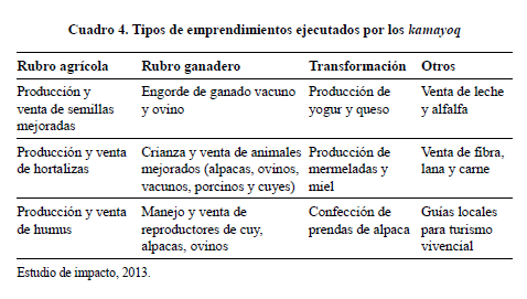 Los emprendimientos indicados están en función de características propias de cada familia de los kamayoq; es decir, según su experticia, el conocimiento, su vocación, el tiempo disponible, los roles de varones y mujeres, el apoyo de la esposa e hijos, la facilidad del manejo y la disponibilidad del recurso. Las actividades más rentables para el piso de valle son la crianza de cuyes y el engorde de vacunos; para el piso de altura, la crianza de alpacas y la venta de ovinos mejorados. Dichos emprendimientos son priorizados —según expresan los kamayoq— porque son de fácil venta, se reproducen rápidamente, el tiempo de inversión es corto y existe ya un mercado conocido.