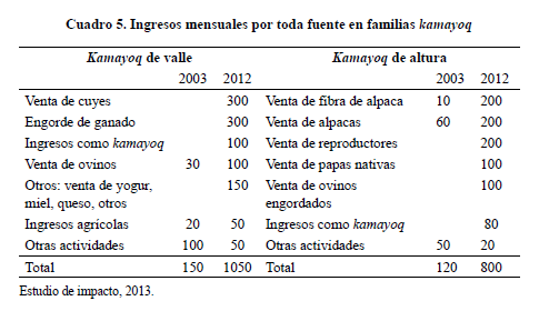 Nos referimos a ingresos provenientes de la comercialización de ganados y de actividades complementarias diversas (albañil, obrero, ambulante, triciclero, carpintero y otros), donde se incluía la venta de productos agrícolas al menudeo, como de algunos animales en las tabladas. El cambio sustancial en la composición del ingreso familiar se da a partir de que los kamayoq se insertan en dos nuevas actividades: (i) como proveedores de asistencia técnica, y (ii) como impulsores de emprendimientos nuevos, que abren las posibilidades a nuevas fuentes de ingreso por producción de cuyes, artesanía y por microempresas familiares (engorde, producción de ovinos mejorados, crianza de alpacas, comercialización de fibra, carne de alpaca).