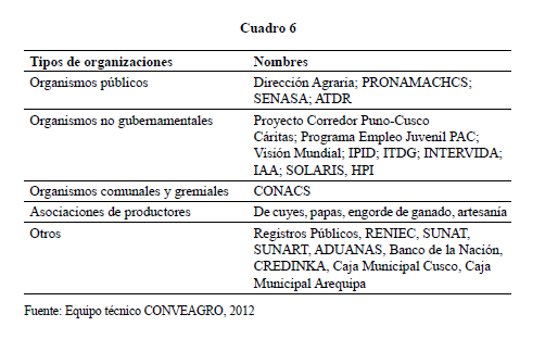 En el período 1998-2009 existió un conjunto de instituciones públicas y privadas que favorecieron el desempeño de los kamayoq. Dicha coyuntura permitió una participación muy activa de los asociaciones de productores promovidas por el proyecto Corredor Puno-Cusco, que contó con la participación de los municipios distritales como instituciones comprometidas en promover y facilitar los procesos productivos en articulación con otros actores, creando condiciones adecuadas en la prestación de servicios de asistencia técnica, desarrollo de capacidades técnicas y de gestión, financiamiento y organización, tal como se aprecia en el cuadro 6.