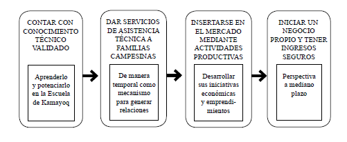 Lo que nunca imaginó la ONG fue que para los campesinos esta perspectiva de desarrollo rural no era un fin sino un medio, es decir, un camino (viable y factible) para insertarse en una propuesta institucional pero cuyo fin era totalmente personal del campesino promotor, orientado a su progreso familiar y como un mecanismo para salir de su pobreza. Los kamayoq, desde su óptica de campesino- productor y premunidos de una visión del mundo culturalmente andino-indígena, entendían y leían la «Escuela de kamayoq» como un medio para instrumentarse técnicamente que les permitiese generarse ingresos y ulteriormente mejorar su calidad de vida. En su visión de desarrollo nunca estuvo planteada la perspectiva de «vivir de los ingresos como proveedor de asistencia técnica» a las familias campesinas del ámbito provincial, sino que asumía esta actividad como una etapa más de su objetivo mayor.