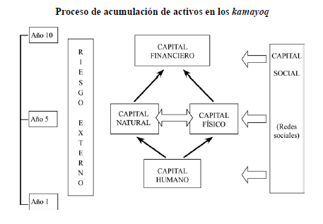 Con los recursos económicos disponibles, las familias del kamayoq activaron la posibilidad de invertir, adquiriendo bienes de capital, instalaciones, equipos e implementos imprescindibles para generar riqueza (capital físico) y cuyos excedentes sirvieron para adquirir también bienes de consumo para el bienestar familiar. Todo este encadenamiento de factores de producción ha estado siempre bajo el control, gestión y administración del kamayoq, pero para hacerlo más eficiente debía recurrir a generar redes y conexiones y participar en grupos de interés (capital social) quienes otorgaron el soporte de relaciones de confianza e intercambios al sistema estructurado.
