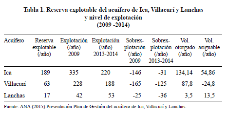 La ampliación continua de la frontera agrícola y la producción intensiva de productos con alta demanda de agua, como el espárrago y la vid, impactaron en el inicio de un ciclo de descenso alarmante del nivel de agua del acuífero del valle de Ica y Villacurí, tal como se muestra en la tabla 1. Como consecuencia, muchos agricultores vieron sus pozos quedar sin acceso al agua por falta de profundidad, mientras que otros sufrieron la salinización de sus fuentes de agua, que perdieron aptitud para la producción de determinados cultivos. Esta situación ha generado escenarios de escasez, sobre todo en el caso de los usuarios que no pudieron profundizar sus pozos —cuando aún estaba permitido hacerlo— o conducir agua desde otras fuentes no salinizadas, debido al alto costo de estas obras.