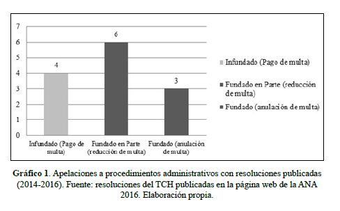 Incluso cuando los funcionarios han llegado a emitir sanciones, la apelación en el Tribunal de Controversias Hídricas - THC ha sido el siguiente recurso para evadir su cumplimiento. En estos casos, los agroexportadores han aprovechado los errores cometidos por los funcionarios públicos, sea en la diligencia (registro de la visita, uso de distintivos, identificación del funcionario, notificación de la visita al propietario, entre otros) o en la formulación de la denuncia. Lo común es que, mediante esta acción, los agroexportadores logren la reducción de la multa e incluso su anulación total. Por ejemplo, el gráfico 1 muestra que, del total de apelaciones resueltas dentro del período 2014-2016 y publicadas en el portal de la ANA, un 70% obtuvo la reducción o anulación de la sanción establecida por las autoridades.