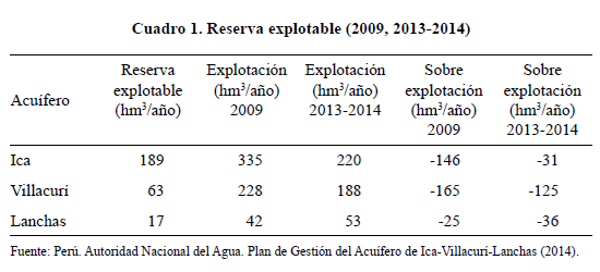 En el caso del recurso común del valle de Ica que son los acuíferos, su explotación intensiva a lo largo de varios años ha llevado a una situación de sobrexplotación. La reserva explotable en el acuífero de Ica era de 189 hm3/año; pero en 2009 se sobreexplotó un volumen de -146 hm3/año, y en 2013-2014 se llegó a una cifra menor de -31 hm3/año. La reserva explotable en el acuífero vecino de Villacurí era de 63 hm3/año; pero en 2009 se sobreexplotó una cifra de -165 hm3/año; y en 2013-2014 la cifra estuvo en -215 hm3/año. Asimismo, la reserva explotable en el acuífero de Lanchas era de 17 hm3/año; y en 2009 se sobreexplotó un volumen de -25 hm3/año; y en 2013-2014 subió a una cifra de -36 hm3/año (ver cuadro 1).