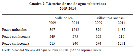 Entre 2009 y 2014, el número de pozos utilizados aumentó tanto en el valle de Ica como en las pampas de Villacurí y Lanchas. El problema principal es que el número de pozos utilizados sin licencia aumentó de 615 en el año 2009 a la cifra de 840 en el año 2014 en el valle de Ica. En el caso de Villacurí y Lanchas, la cantidad se incrementó de 694 pozos sin licencia a 1271 en el mismo período. Es claramente mucho mayor el porcentaje de pozos sin licencia que los que tienen licencia para funcionar (ver cuadro 2).