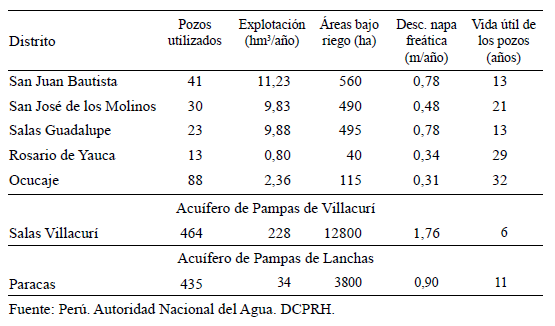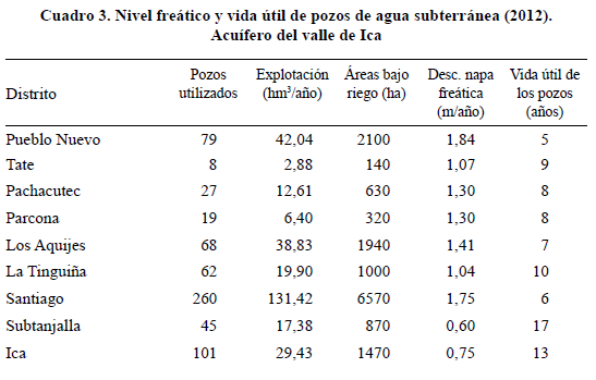 La «tragedia de los recursos comunes» tiene su expresión en el descenso del nivel o napa freática de los acuíferos de Ica, Villacurí y Pampa de Lanchas (Quintana, 2011). Si la velocidad de dicho descenso se mantiene en la tendencia máxima observada por la ANA (2012), entonces la vida útil de varios pozos en Ica será de entre once y cinco años a partir de 2012 (ver cuadro 3) si no se produce una recarga del acuífero o se regula la sobrexplotación.